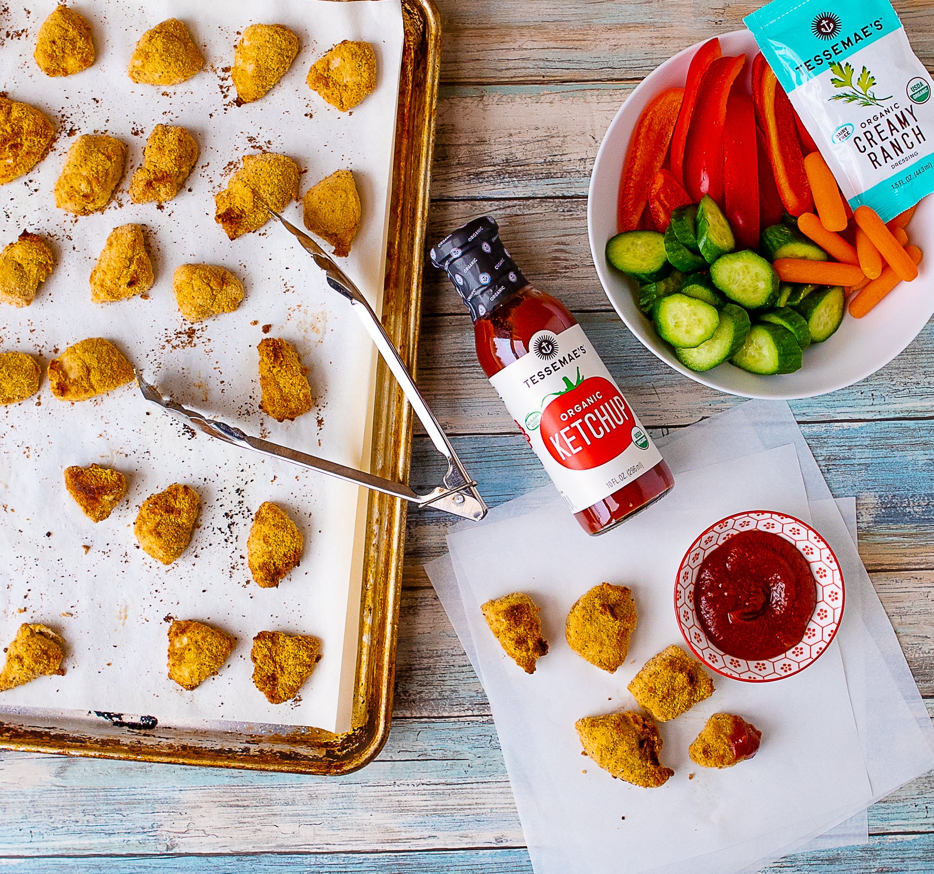 Real, tender chicken nuggets are so much easier than you think! We use chicken tenderloins, which are super easy to cut up and come out perfectly. A quick toss in our Mayo adds egg for the coating and plus SO much flavor. (Have you tried our new and improved Ketchup!? You'll love it!)