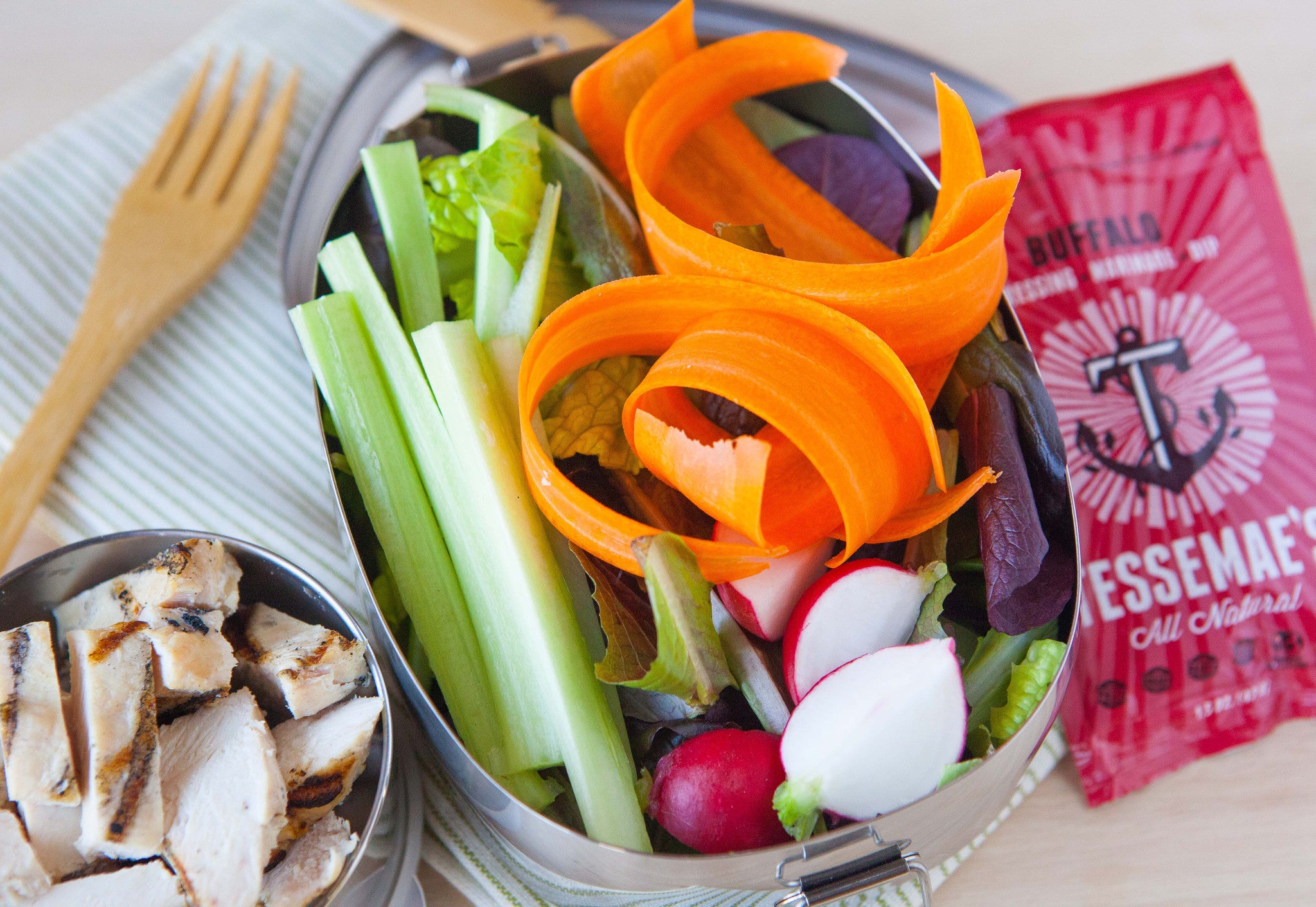 We're still chugging along on that January Whole30 and this easy throw together lunch is just the mid day pick me up we all needed! Thank the lord for our new Buffalo pouches! Here, we use the sauce as SALAD DRESSING! How have we never tried this before??