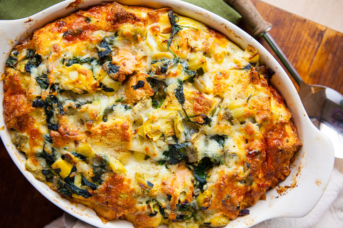 This is the perfect indulgent breakfast! (Like Spinach and Artichoke Dip you can eat with a fork!) Make this strata a day ahead, so all you have to do is pop it in the oven. Round out the meal with some bacon or ham and fruit salad to really impress. If you don't want the bread, try our Sweet Potato, Sausage & Egg Bake, or make this one replacing the bread with roasted sweet potato cubes.
