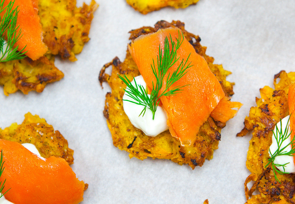 These tasty pancakes (a twist on latkes) and had the whole Tesse team drooling today!! The sweet potato and apple give them awesome flavor and the smoked salmon is a perfect topping. They're a super impressive app for any holiday party and are easy to make ahead (see our tip below!) We made a paleo/ gluten free version with almond meal that is super tasty. Check out the step by step pics at the end of the post!
