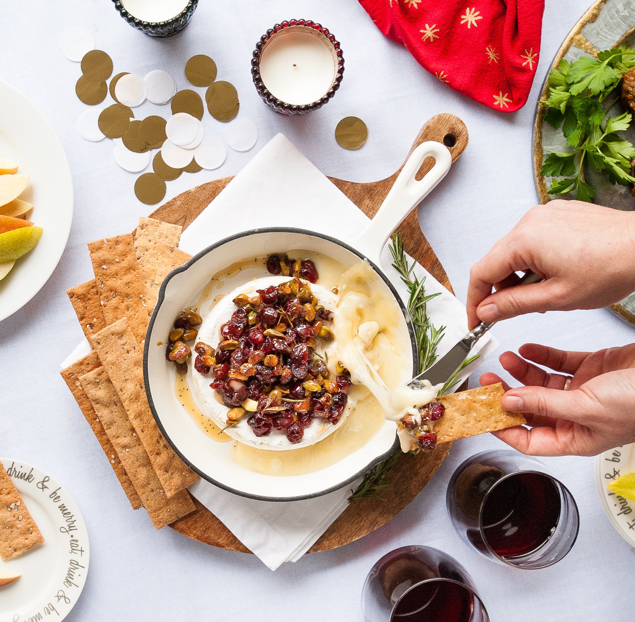 Our easiest festive party app is also the most delicious! This Baked Brie is packed with flavor and so ooey gooey melty. If you bake and serve it in a skillet, the cheese will also stay warm for a good amount of time.