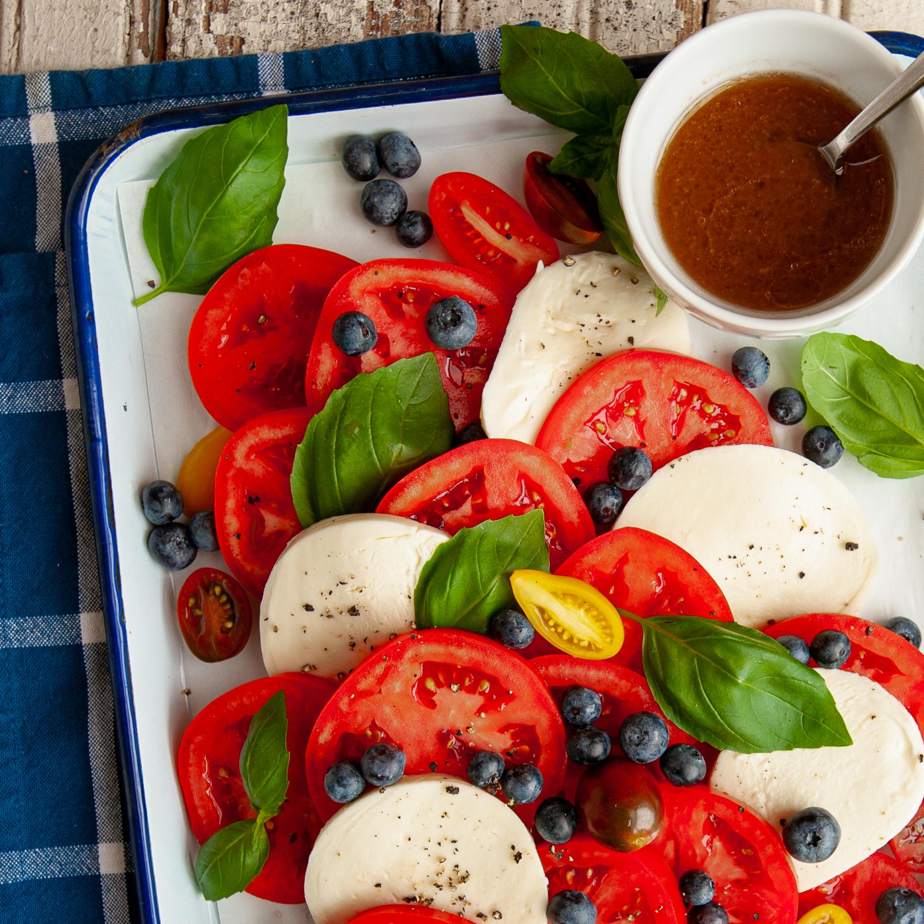 We re-imagined caprese salad into a perfect, simple 4th of July side dish. The sweetness of blueberries and tangy Balsamic are a dream combo!