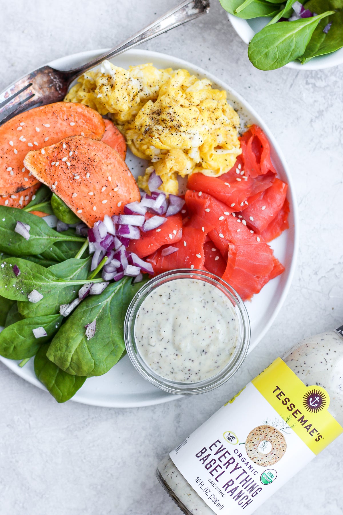 You wont miss the bagel for one second with all the goodness in these platters! Smoked salmon, red onion, eggs, and of course our Everything Bagel Ranch to top it all off. This makes a lovely brunch... but we also love these flavors as a breakfast for dinner!