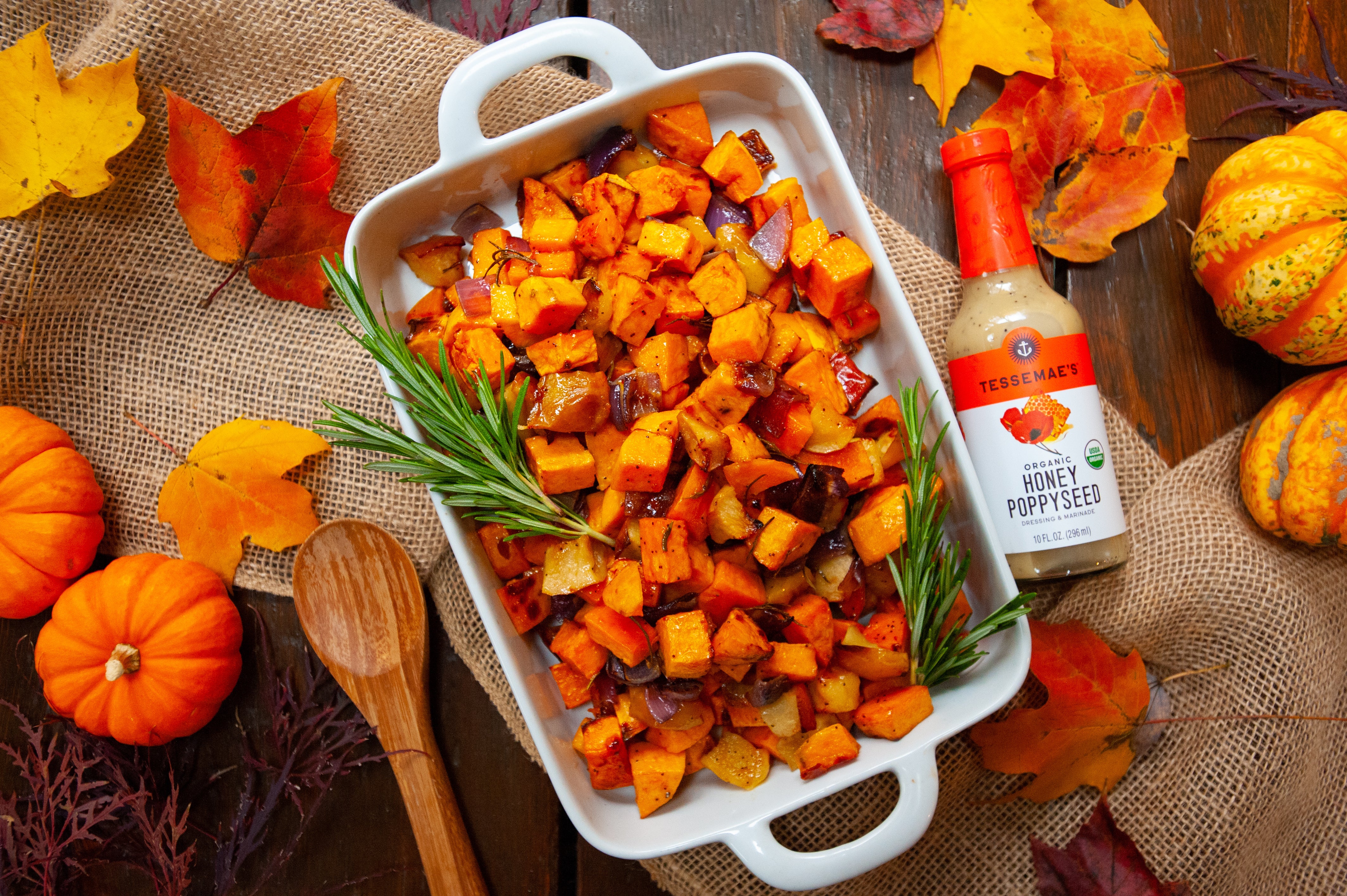 Switch up your sweet potatoes this year with this sweet and tangy recipe! Our Honey Poppyseed coats all of the veggies and helps them perfectly caramelize as they roast, the result is a Thanksgiving worthy side dish that may just become part of your annual meal!