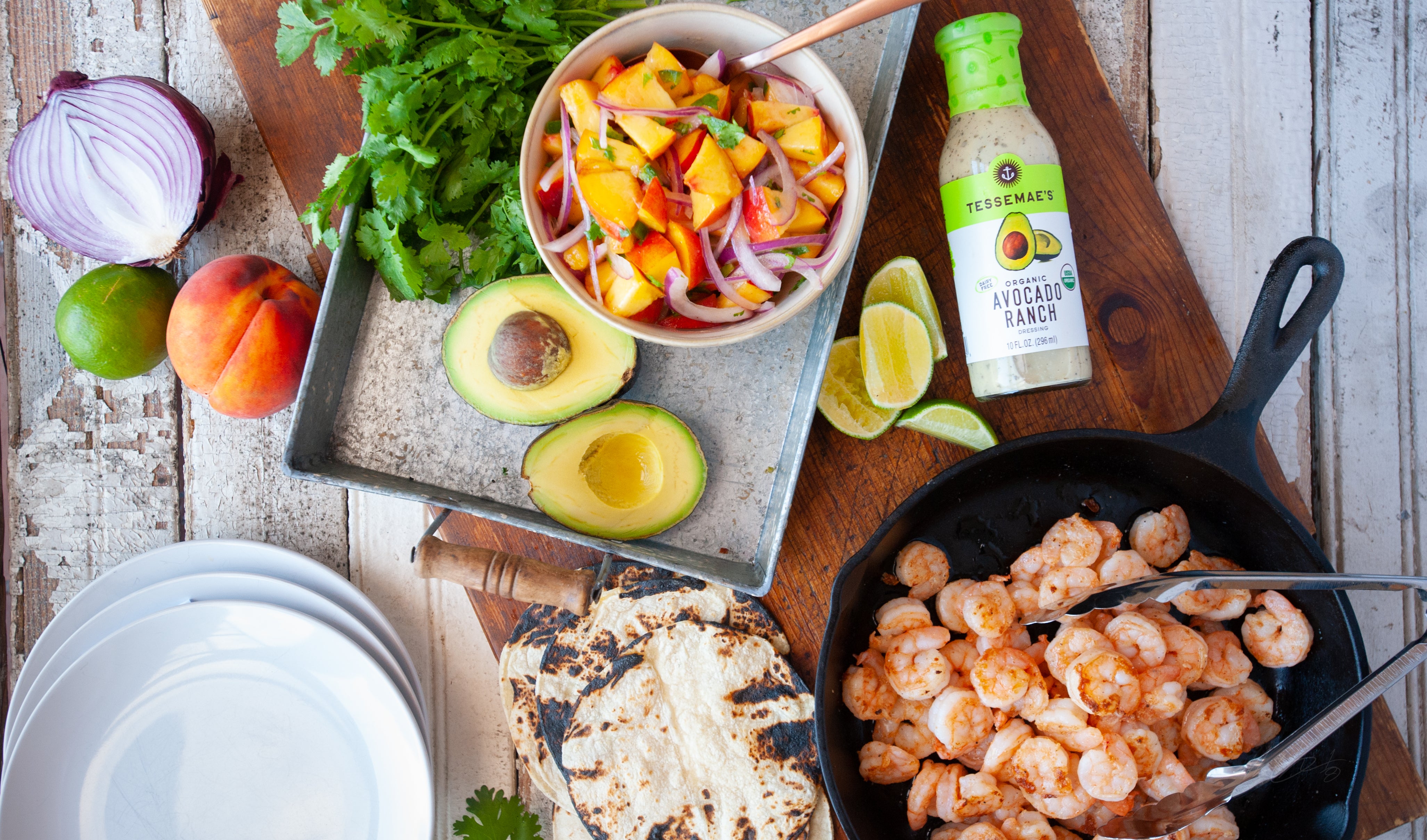 Seared Shrimp Tacos with Peach Salsa & Avocado Ranch