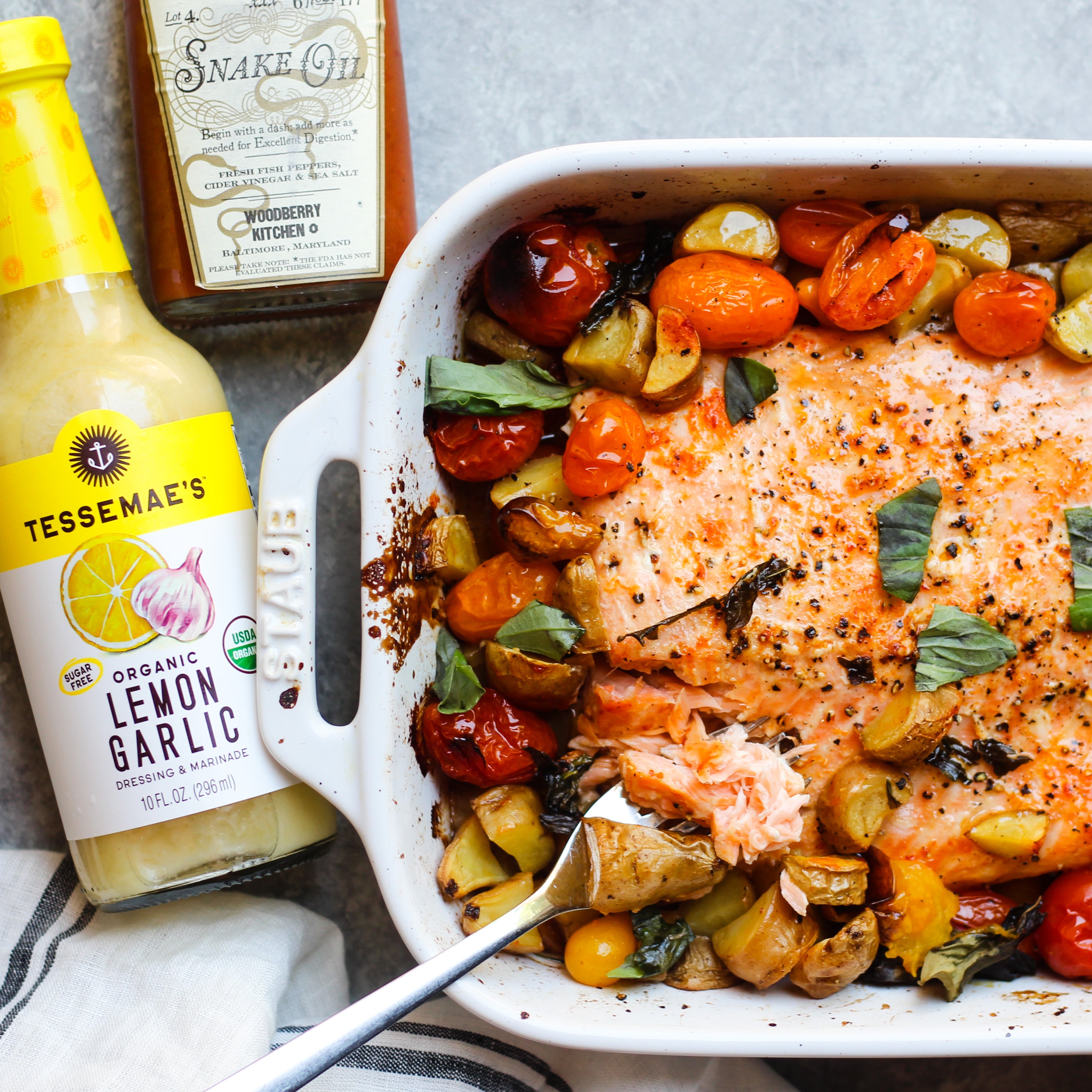 One pan dinners make us smile! This easy dish comes together so fast, but is packed with flavor from the Summer tomatoes and Fresh basil. Serve on it's own or over baby arugula.