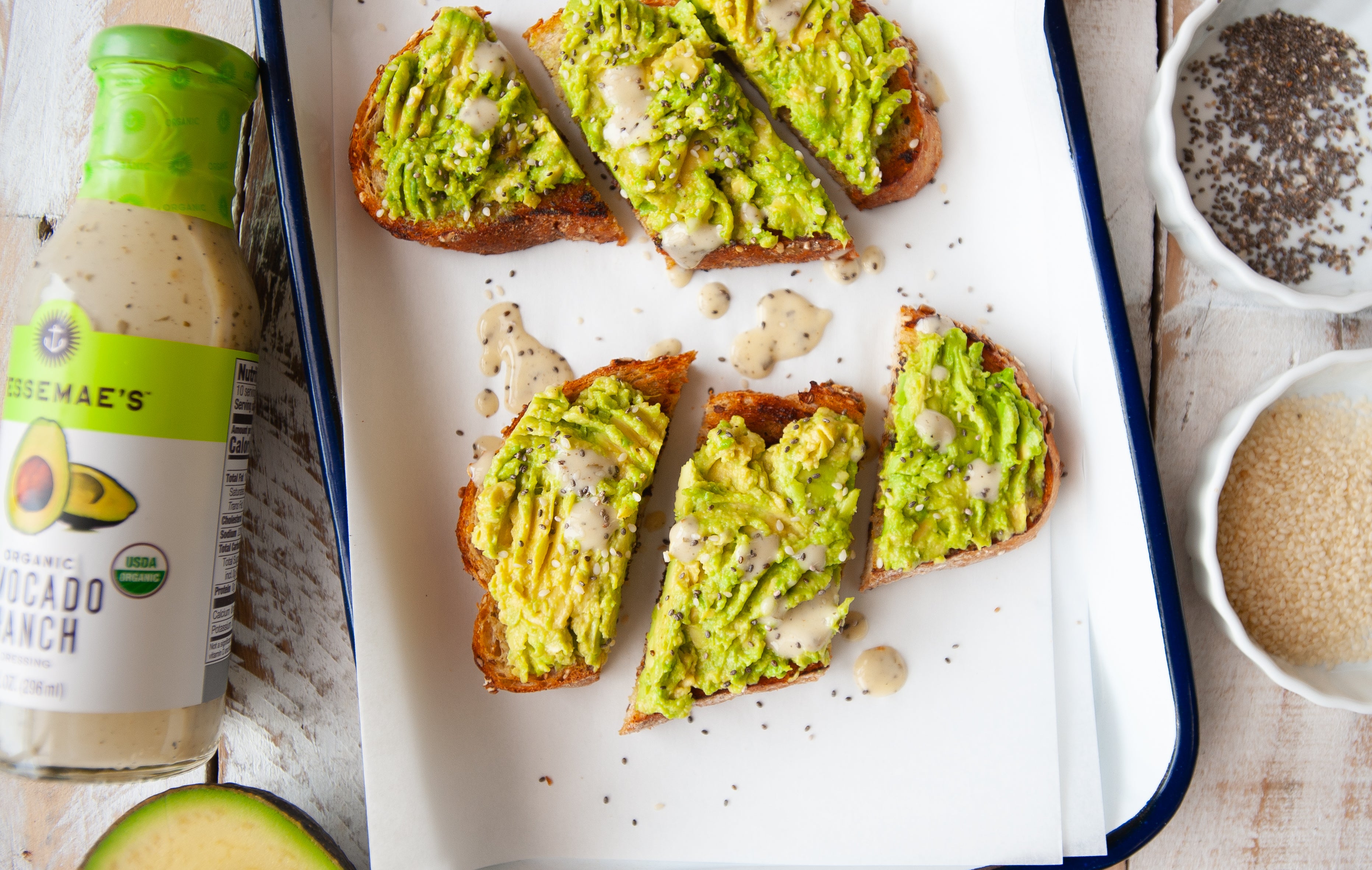 No Recipe here guys! Just spread our Avocado Ranch on sliced bread, griddle in a large skillet until browned and top with smashed avocado, more Ranch and seeds! Enjoy!