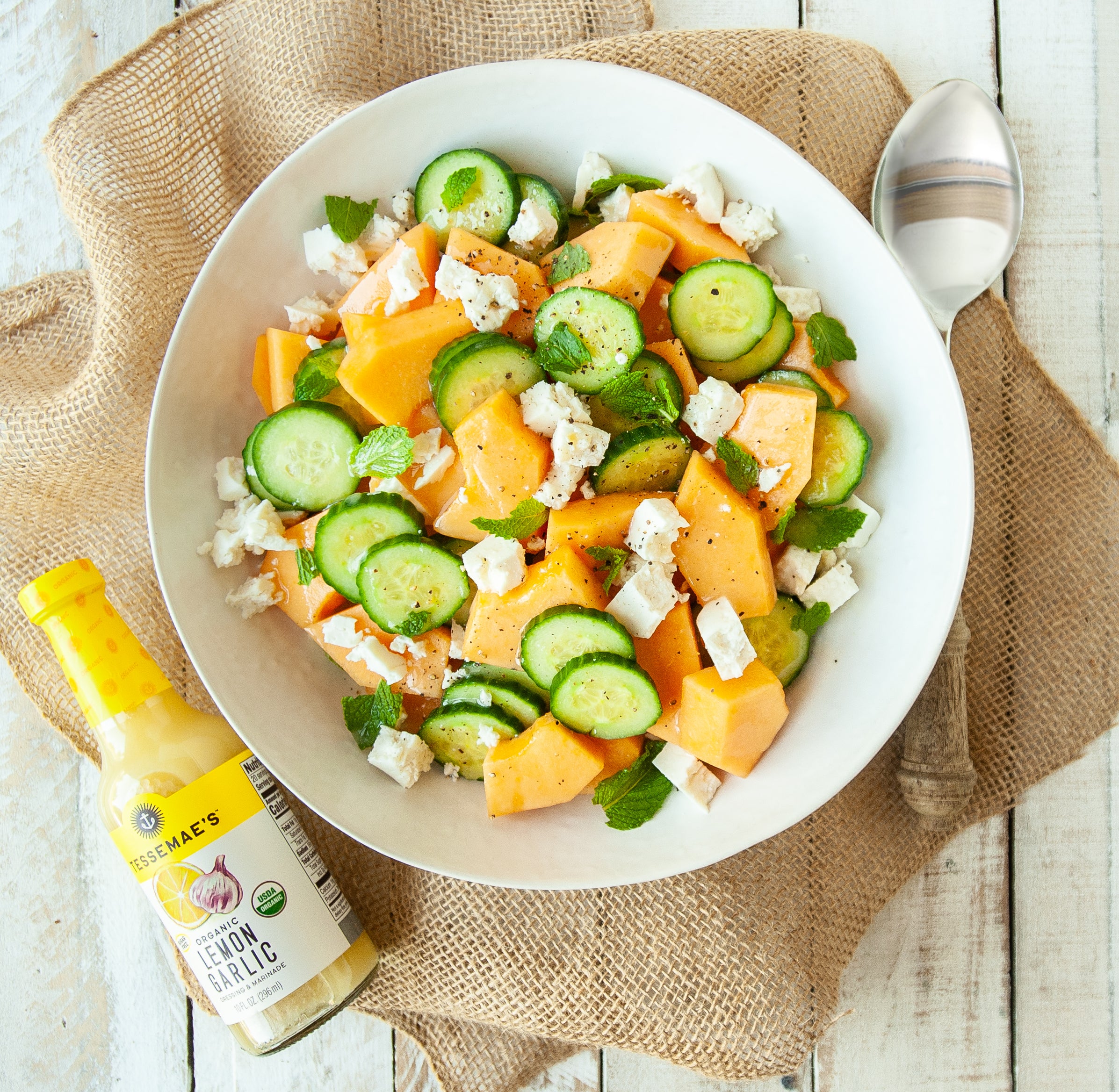 This easy, no cook side is perfect alongside simply grilled meat to help you get dinner on the table fast! This recipe calls for a whole cantaloupe and will serve 8. To serve 4, just reduce all of the amounts by half.