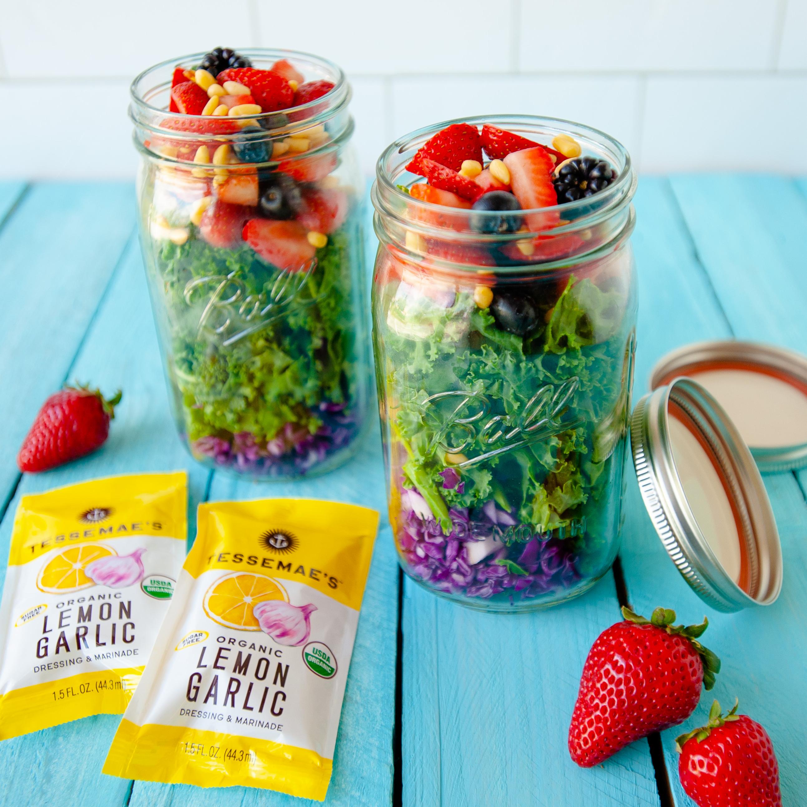 These colorful salads are packed with a rainbow of nutrition! Fresh berries, chopped kale, pine nuts, and sliced steak all covered in our Lemon Garlic!