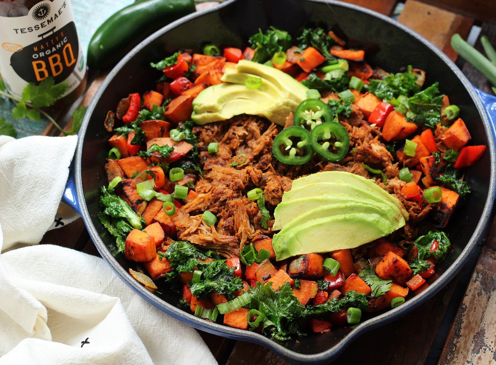 This skillet meal is perfect for weekend brunch, but easily doubles as a fun weeknight dinner. It's perfect to use up leftover pork (here's an easy one!). If you don't have any leftovers... try a clean label store bought product, or swap in shredded rotisserie chicken!