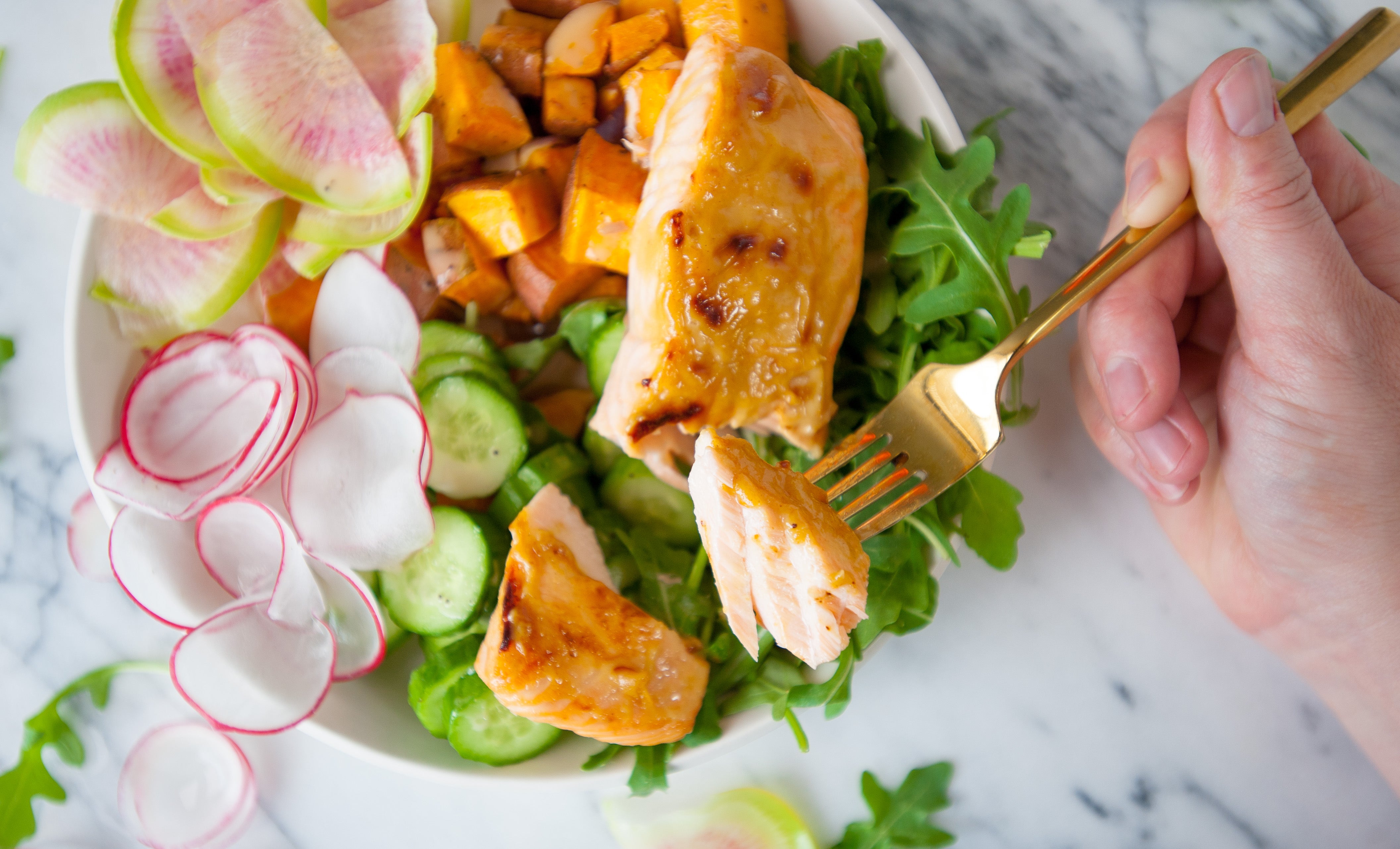 Our fool-proof way to cook salmon makes this bowl with #alltheveggies so easy and delicious! We love the spicy bite that these thinly shaved radishes and baby arugula bring, a perfect way to cut through the rich fish.