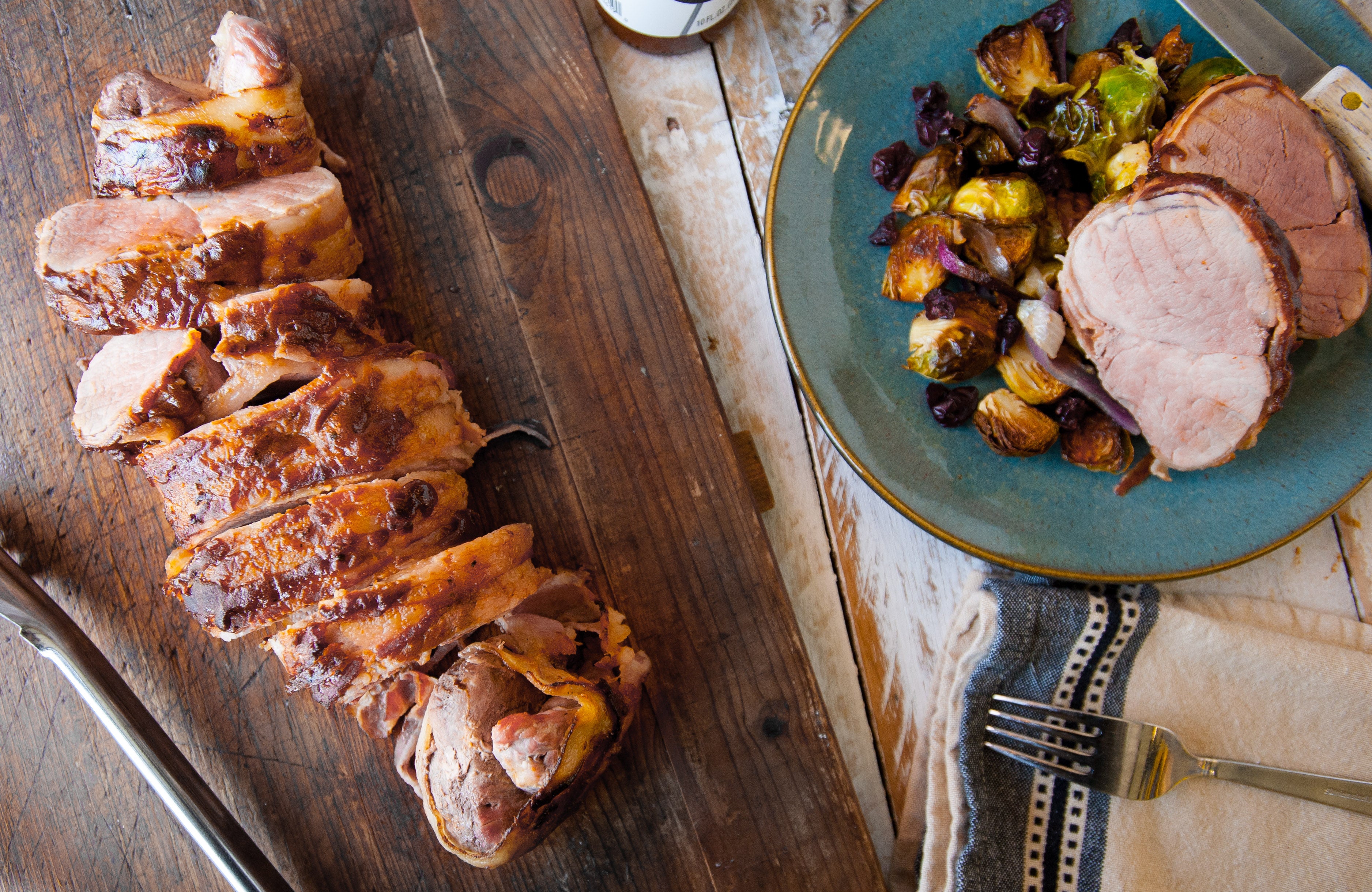 Bacon Wrapped Pork Tenderloin with Brussels Sprouts