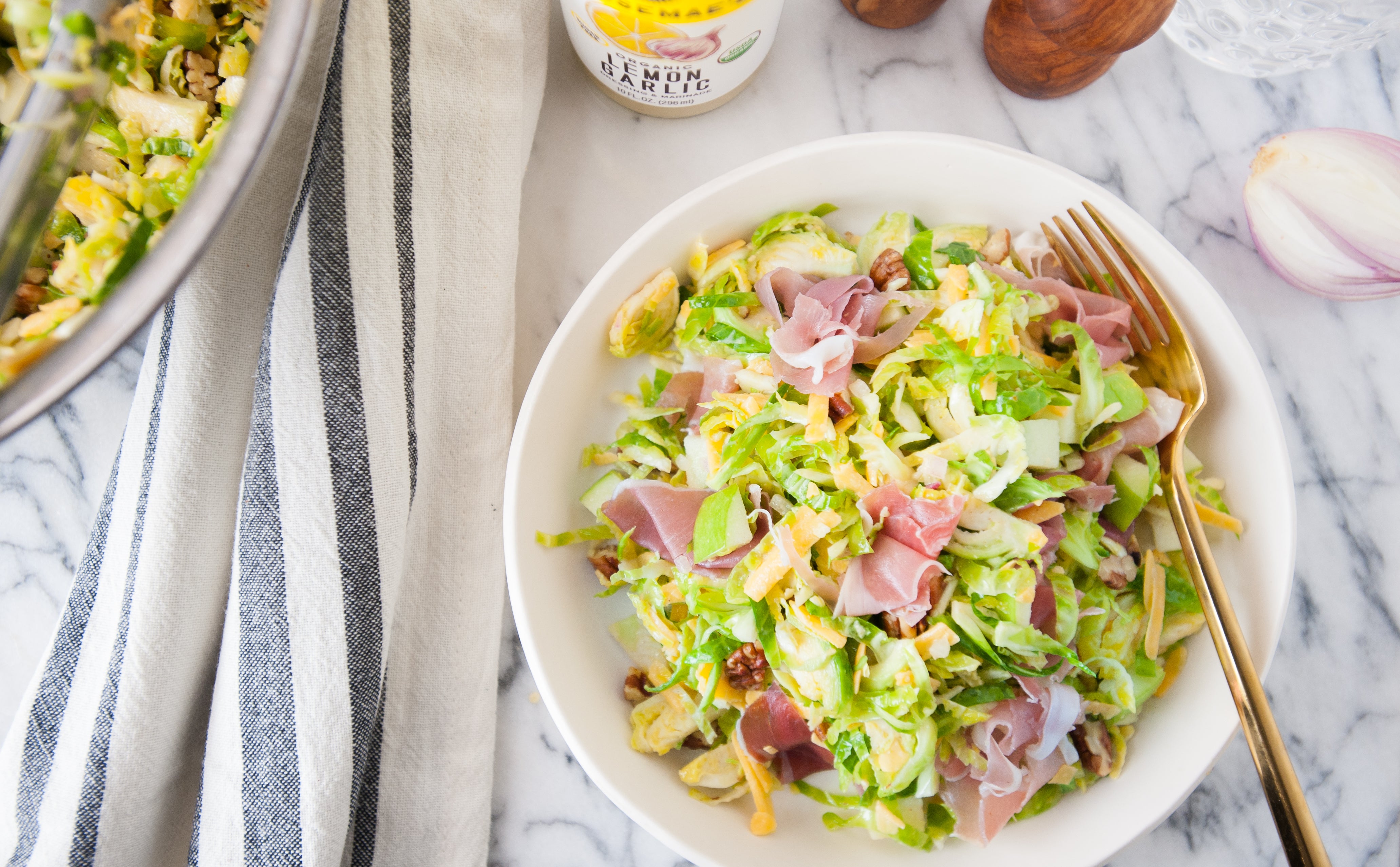 Brussels Sprout Salad with Cheddar, Prosciutto & Pecans