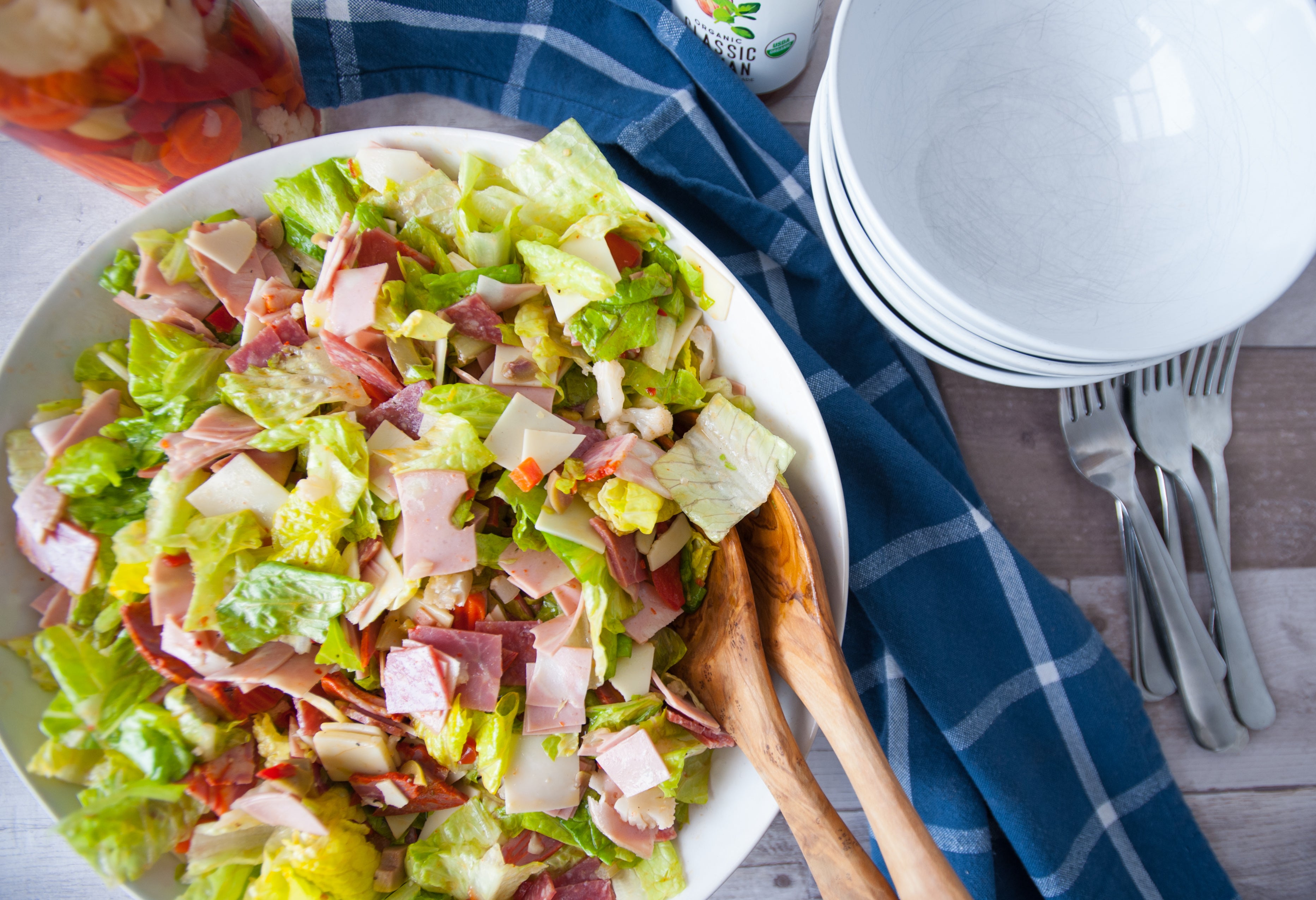Never heard of a muffaletta? It's classic sandwich from New Orleans, and we thought it would be even tastier (and easier, and more healthful.....) in salad form. Combine a mix of cured meats, creamy provolone cheese, and briny pickled veggies and olives with some fresh greens and you'll feel like you're in the French Quarter at Mardi Gras.