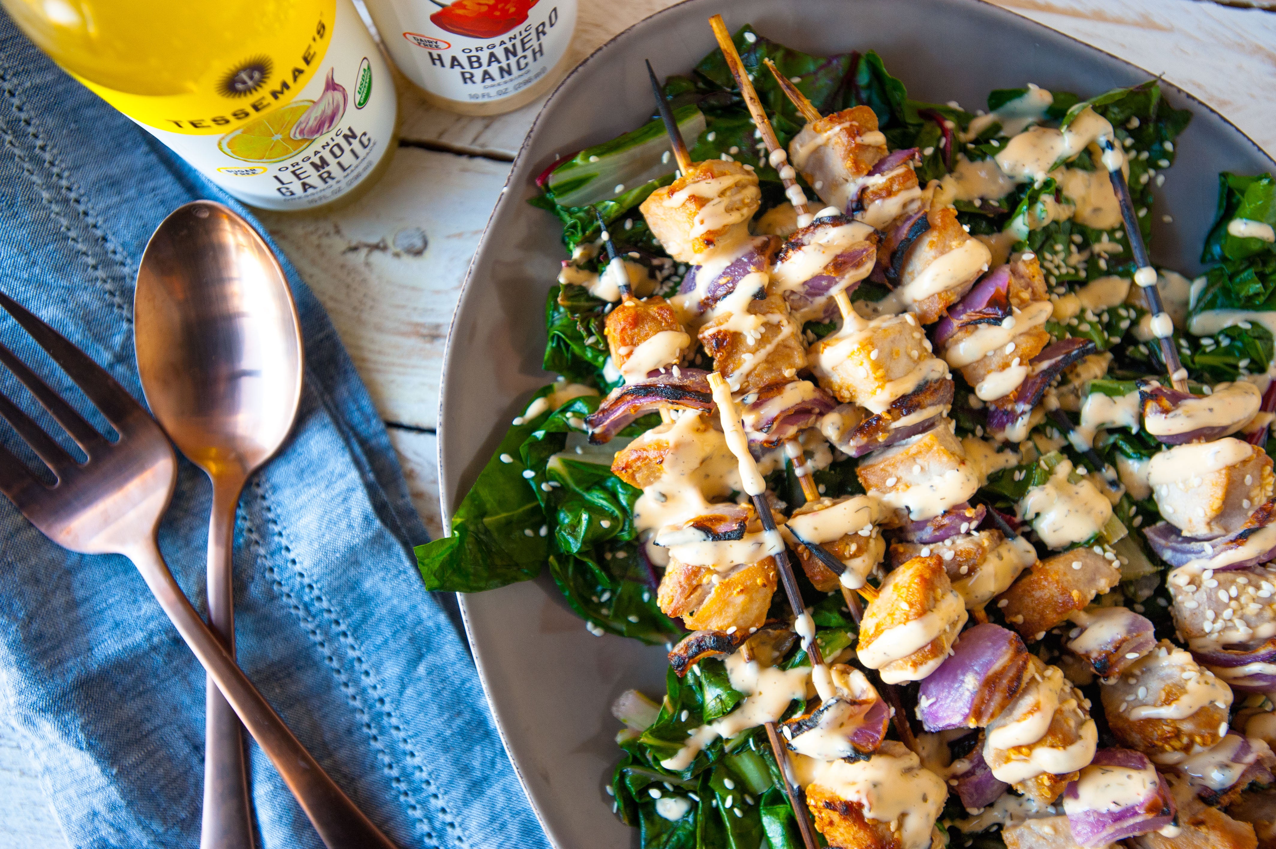 Spicy Tuna Kabobs with Swiss Chard & Zesty Tahini Sauce