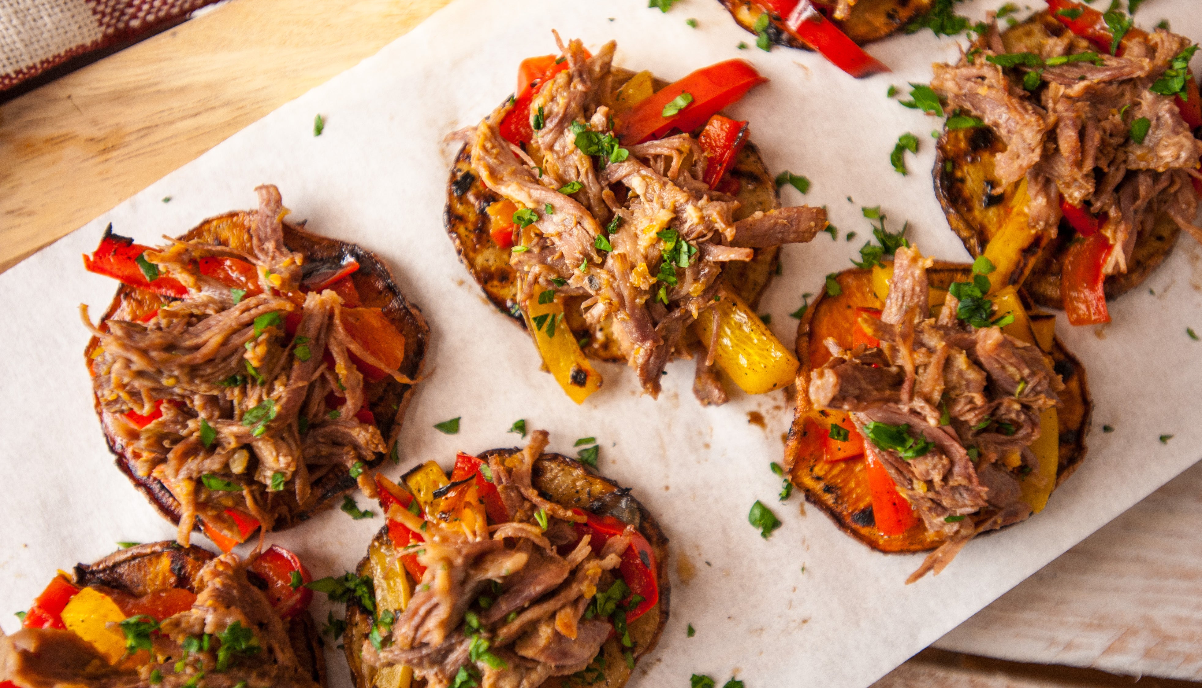 - Grill peppers and potatoes until browned. Top potatoes with grilled peppers, shredded ribs, then sprinkle with parsley.