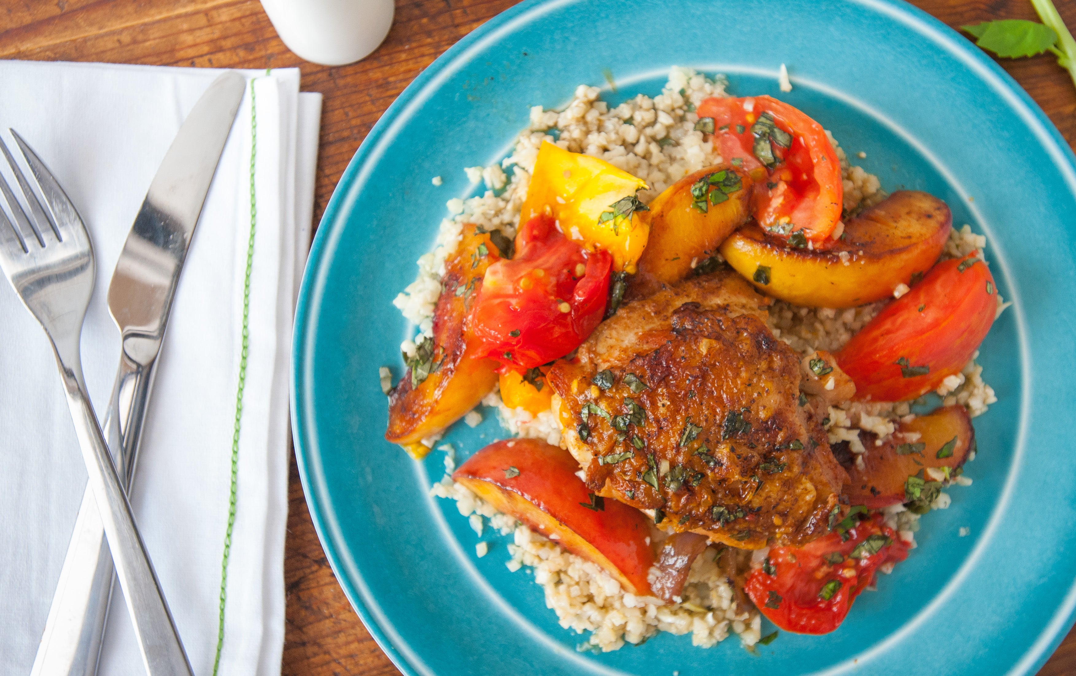 - While ribs are cooking, Heat grill or grill pan to medium-high heat. Toss peppers and potatoes with remaining ½ cup Balsamic and salt and pepper to taste.