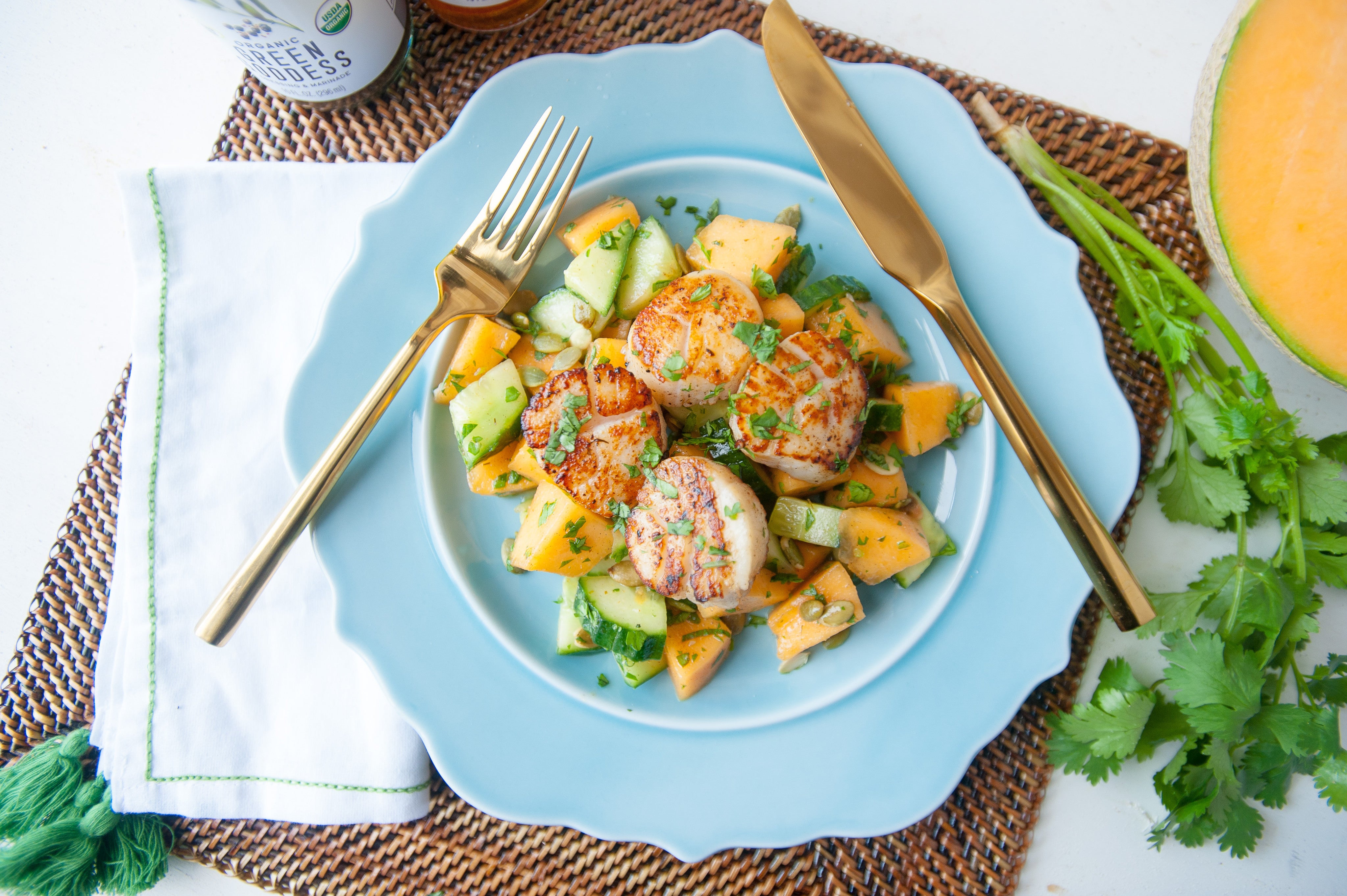 We LOVE it when it warms up because that means more cukes and melons. Here, we put them together in a new (better?) way—we added a bit of heat and some new spices—coriander and cardamom. Add seared scallops (or any other protein, for that matter), and dinner couldn't be easier.