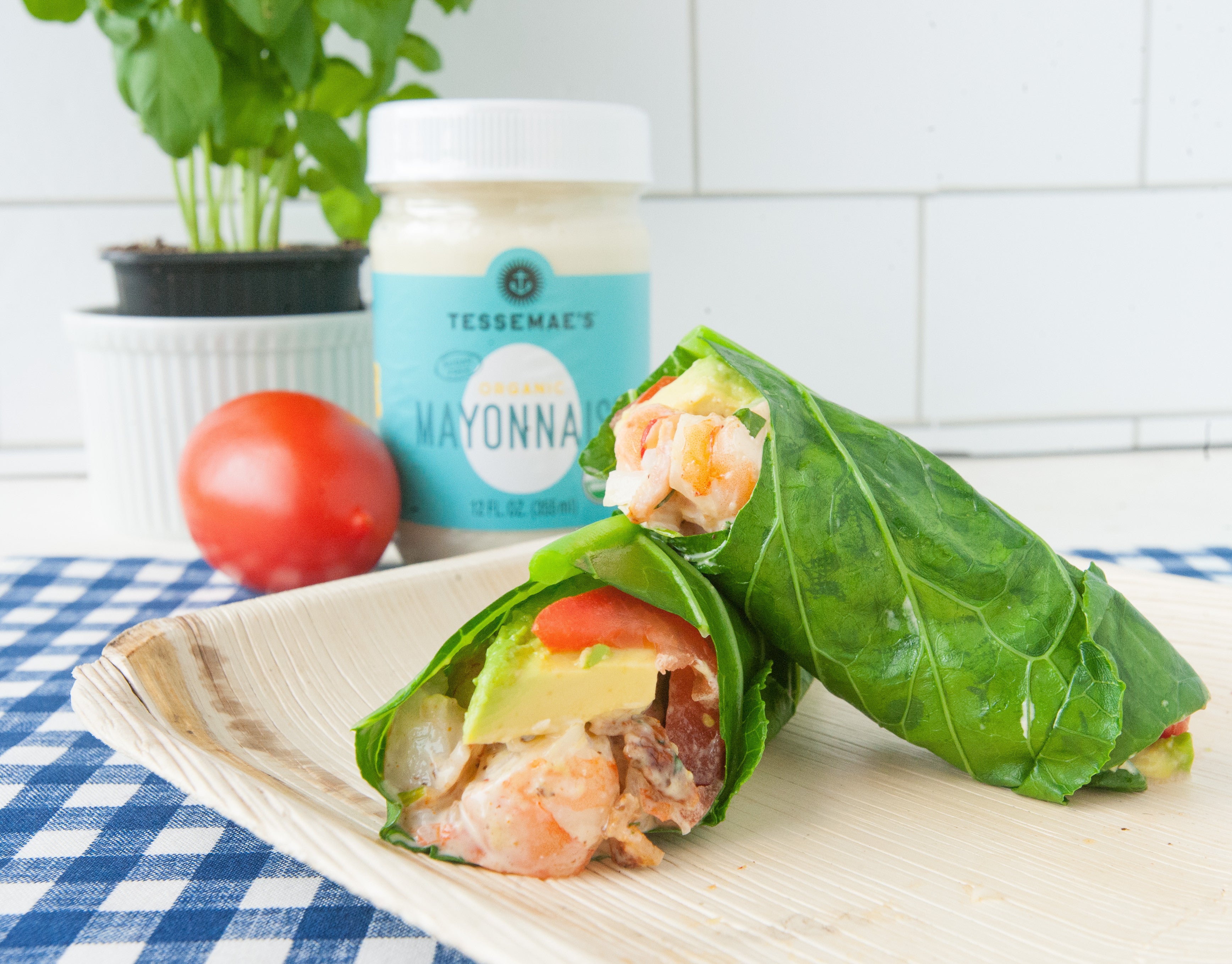 These are a perfect example of balance, yin and yang, and harmony. A super-delish, slightly decadent shrimp salad, tucked into a super wholesome collard green roll-up. The best of both worlds!