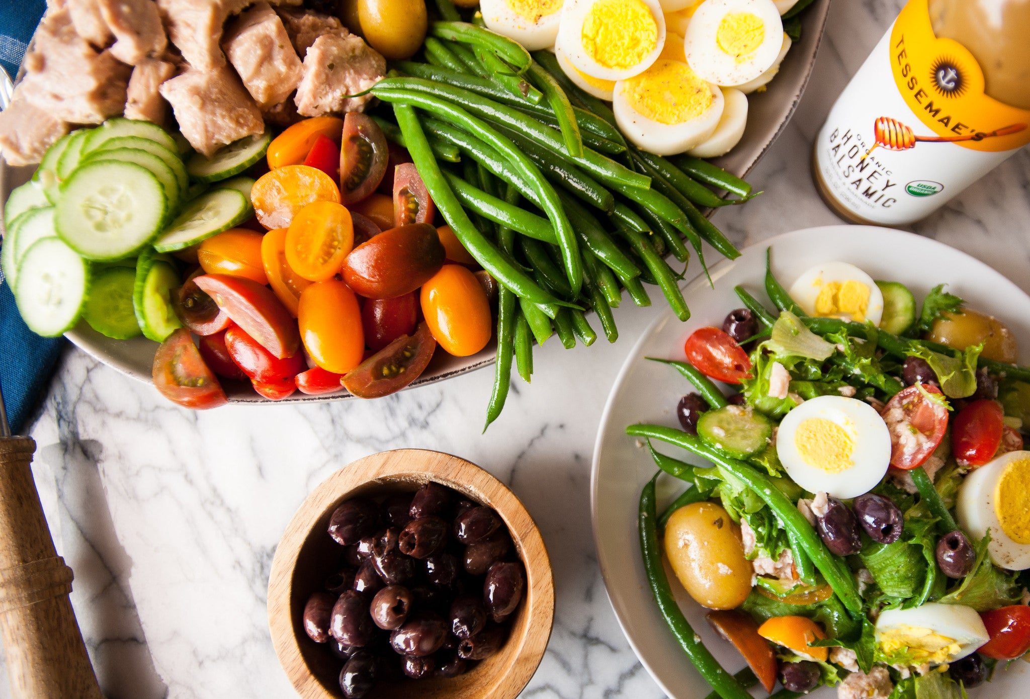 Doesn't get much easier than a composed salad platter that requires almost no cooking and where everyone can help themselves. Also doesn't hurt that it's almost too pretty to eat. Almost, mind you.