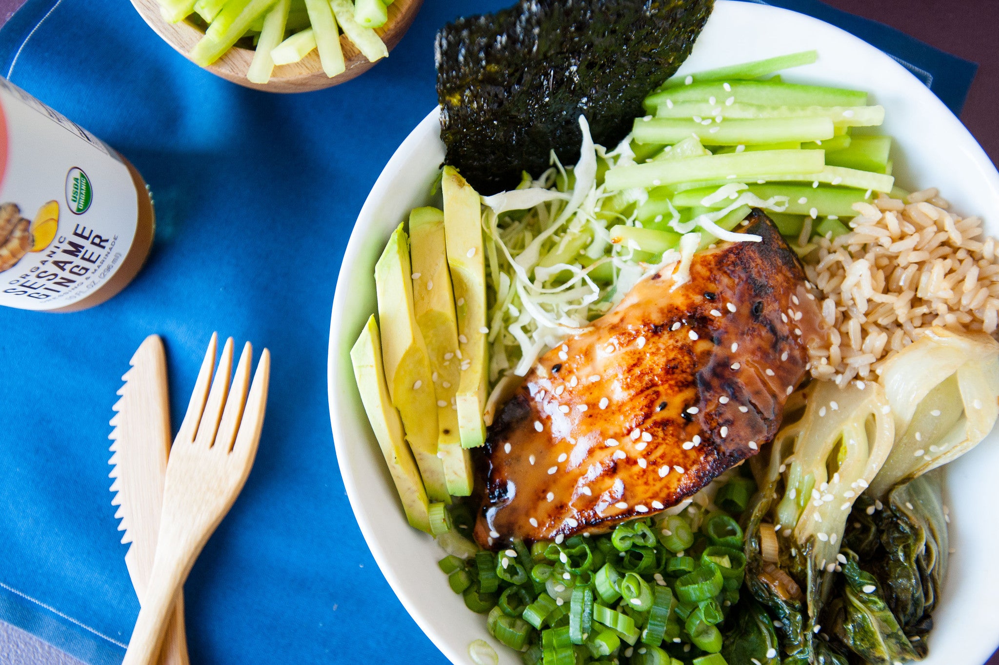 Hey, why not assemble this beauty of a bowl for a quick and easy dinner tonight? It comes together in a snap—just do all your chopping while your salmon is marinating and roasting, then assemble and devour.