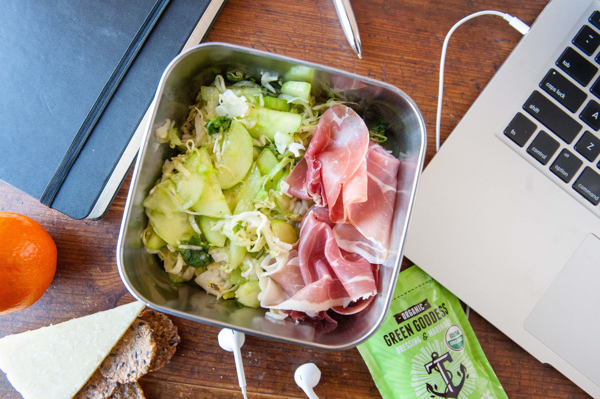 Not sure about you, but we refuse to eat any more sad sandwiches while working through lunch, you guys. So, the next time you find yourself eating al desko, whip up this super easy marinated veggie salad (you can even subtract and/or add different veggies you might have on hand), some quality protein, and maybe even a lovely piece of cheese to round out the meal.